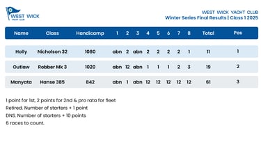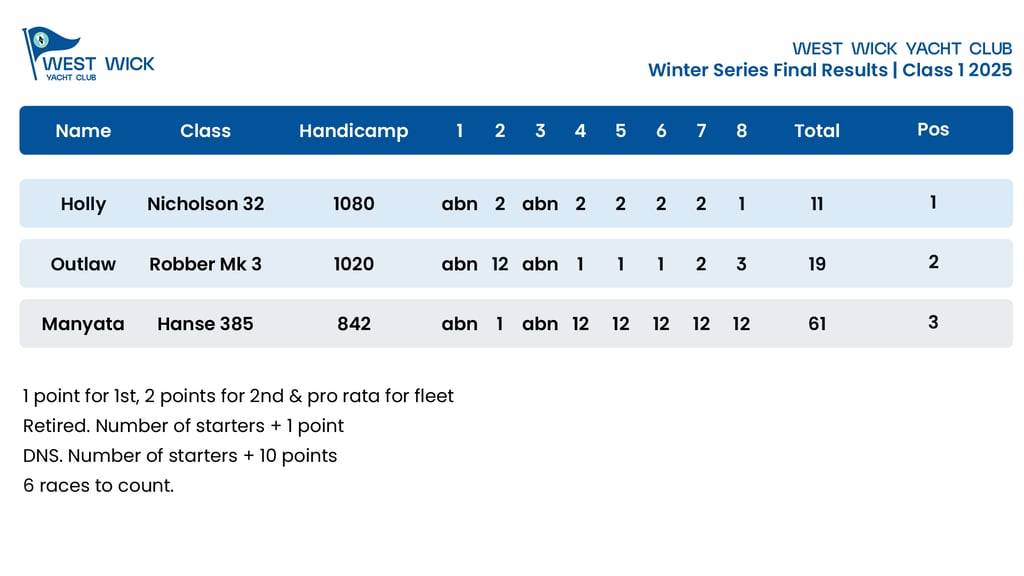 Looking back at the end of the 2025 season, the Winter Series provided some close racing off North Fambridge. During our 2026 Fitting Out Dinner, Club Commodore, Andrew Rogers presented the winners of the WWYC Winter Series Racing with their awards and prizes. With the final points tallied across the eight scheduled races, here is how the Class 1 fleet finished up.